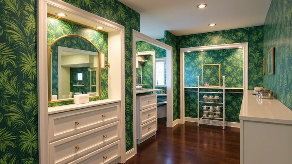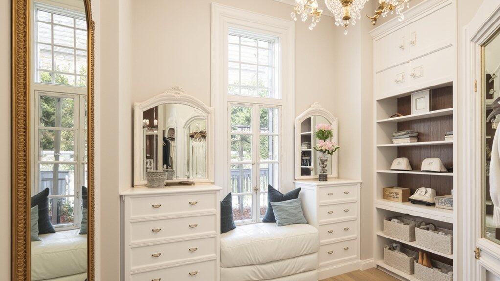 As you enhance your walk-in closet, consider adding stunning mirror accents to boost both style and function. Mirrors reflect light, making your space look bigger, and help you check your outfit easily. Install them strategically for the best effect.