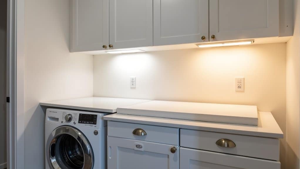 After setting up your utility sink, let’s tackle the next key element: optimizing lighting placement in your laundry room. Good lighting helps you see stains and sort clothes easily.