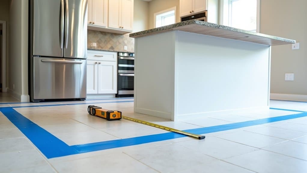 Mark the spot with tape, leaving 48 inches from counters. Confirm it’s level before installation. You’re set for a functional island layout now!