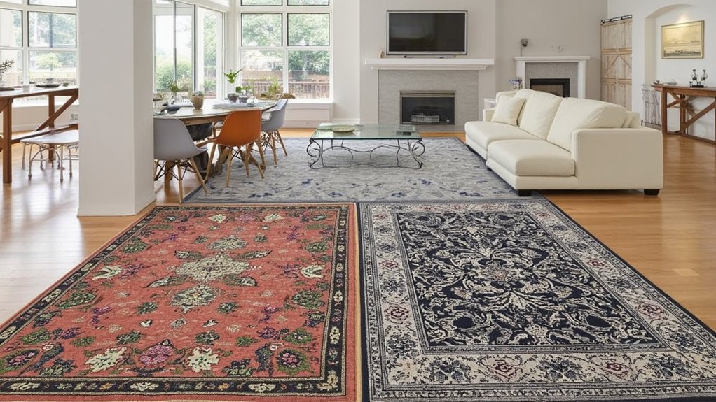 Strategic placement of area rugs creates instant visual separation between your living and dining spaces without blocking sightlines or natural flow. You’ll want to select rugs that complement each other while defining distinct zones.