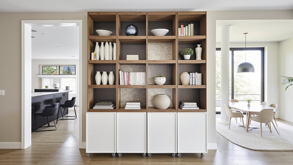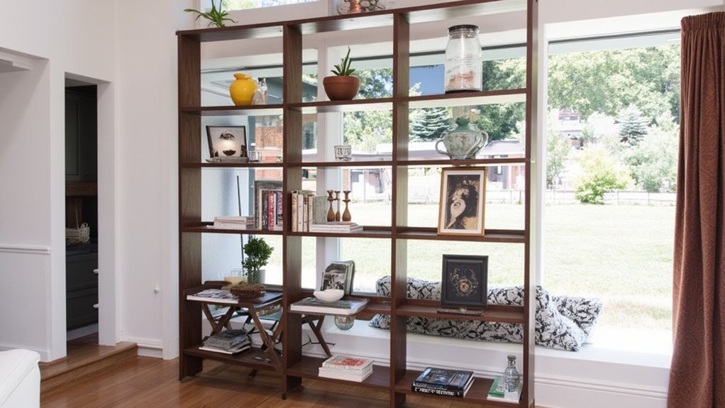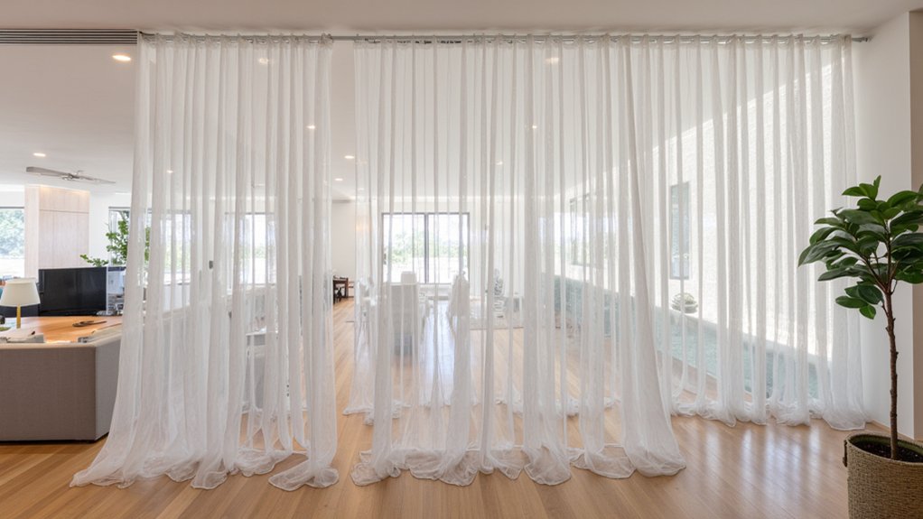 Flowing curtains offer an elegant and flexible solution for dividing your living and dining spaces without permanent construction. You’ll appreciate how curtains can instantly transform your space while maintaining the option to open them fully when desired.