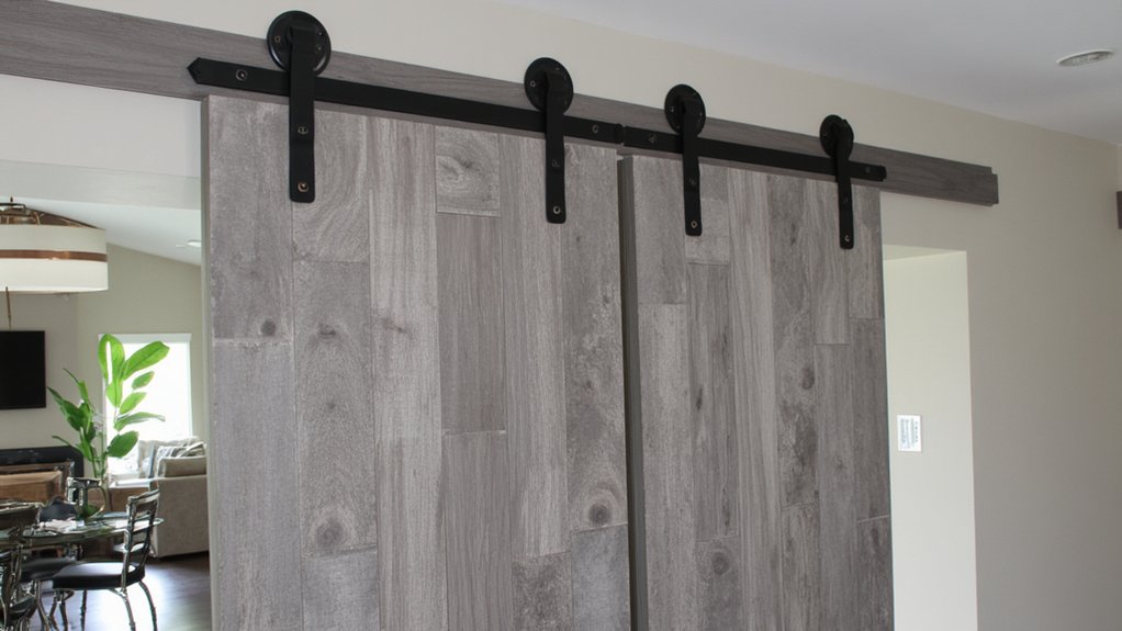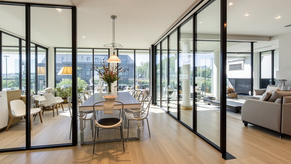 While sliding barn doors offer rustic charm, glass partition walls provide an elegant solution that maintains visual flow between spaces. You’ll create a sophisticated boundary while keeping both rooms bright and open.