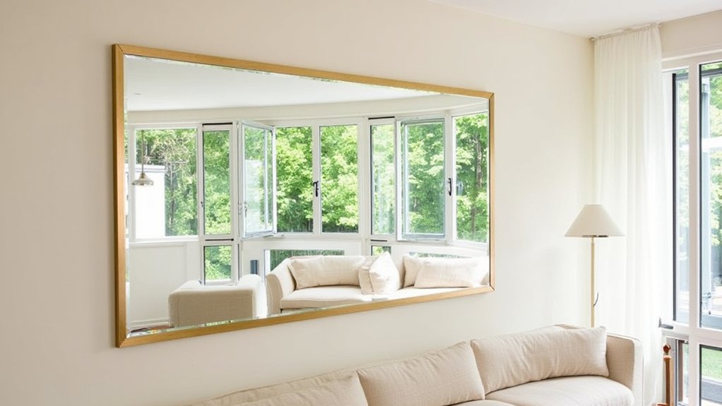 - Place a large mirror (at least 24×36 inches) on the wall opposite your brightest window to double natural light