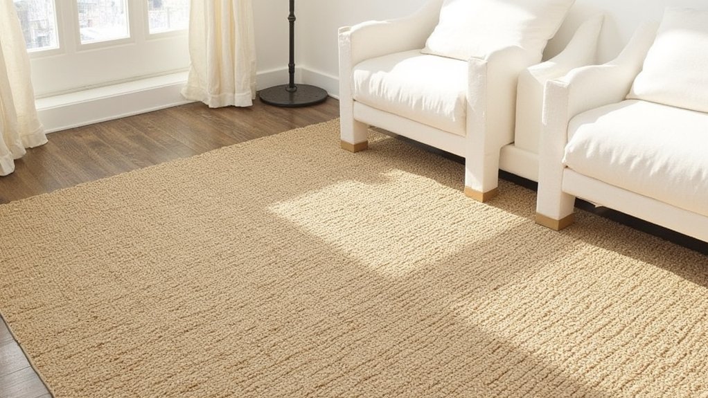 When selecting rugs for ideal feng shui, natural fibers create grounding energy and harmonious flow throughout your living room. “Natural materials like jute, sisal, wool, and bamboo silk help anchor the space while allowing chi to circulate freely,” explains feng shui consultant Sarah Wong.