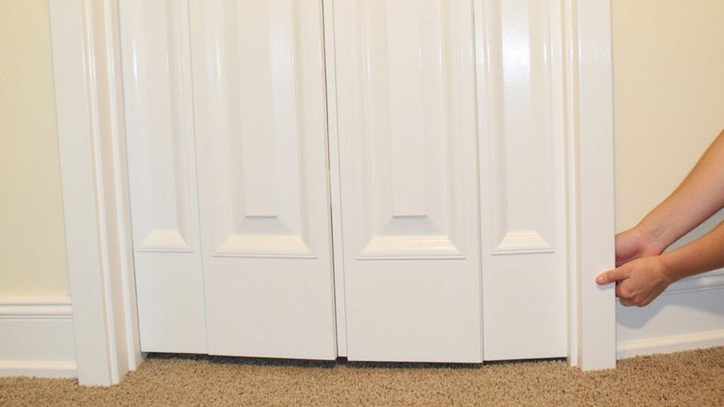 Precision matters when you’ve just reinstalled your folding closet door, and testing its movement is the next key step. You’ve gotta make certain it glides smoothly along the track without sticking or wobbling. Grab the door handle and let’s get started with a careful check.