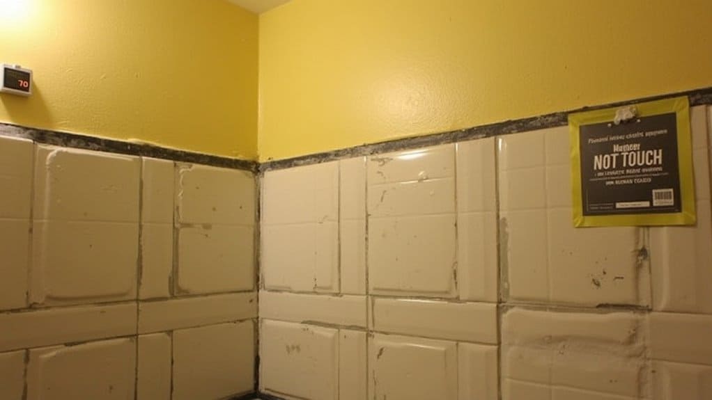 Moving from sealing grout to the next important task, let’s focus on letting the mortar cure properly after reattaching your bathroom tiles. This step guarantees durability, so don’t rush it.