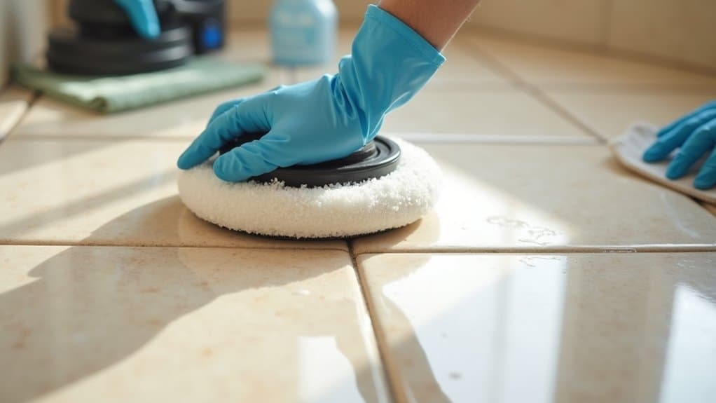 Let’s shift focus to buffing your bathroom tile surface for a polished, professional look after confirming proper alignment. This step enhances the tile’s appearance and preps it for sealing.