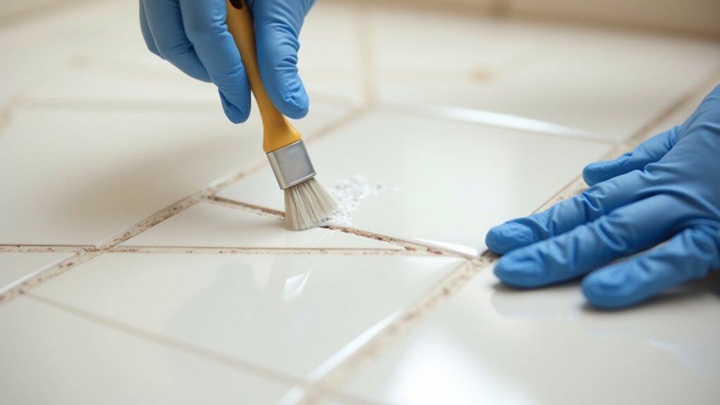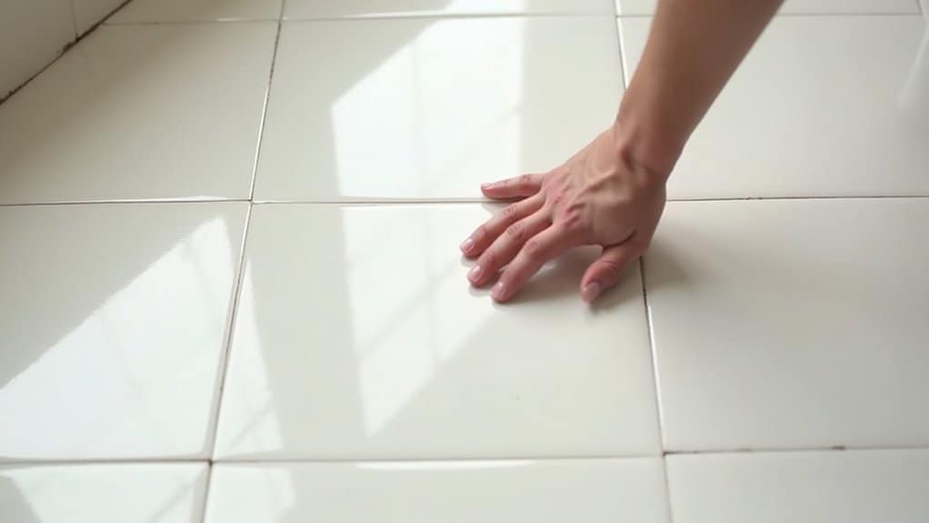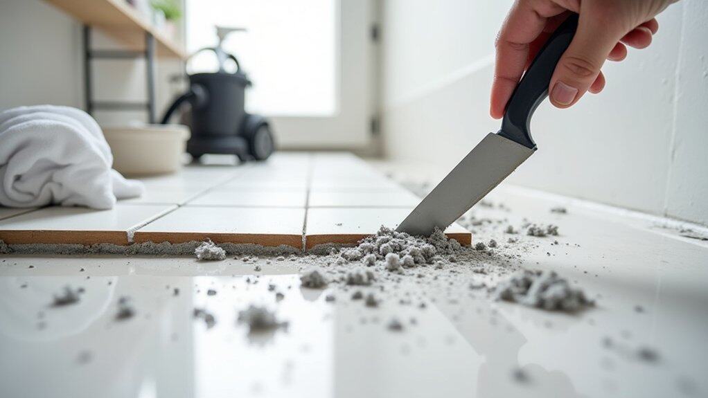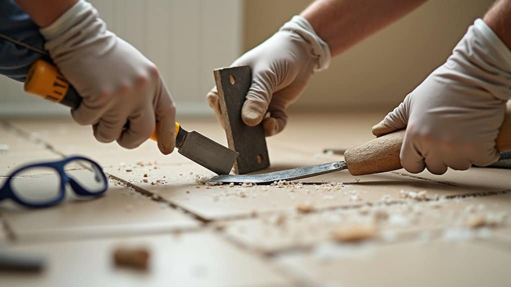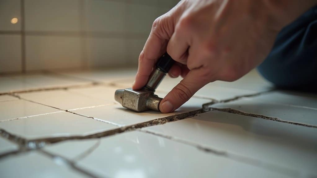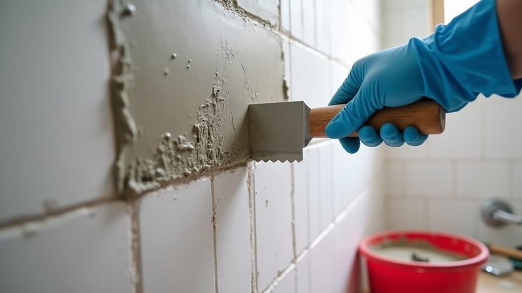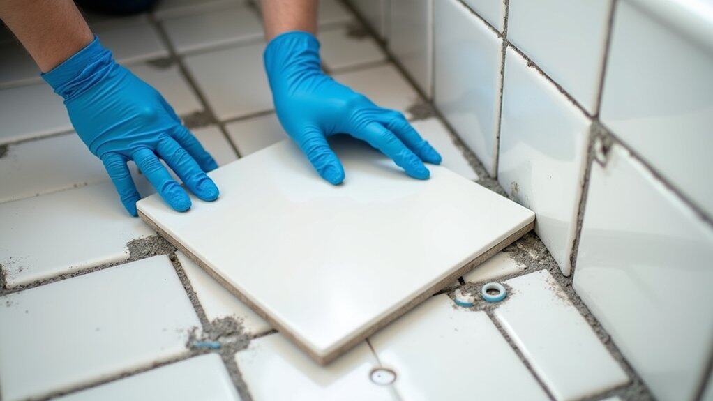 Start tackling those loose bathroom tiles by carefully removing them to avoid further damage. You’ve gotta act fast to prevent cracks from spreading across your floor or wall.