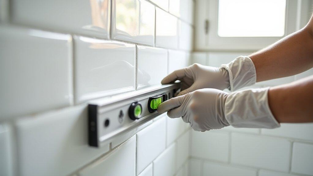 Dig into the critical task of checking your tile alignment once the mortar has cured for at least 24 hours. This step guarantees your bathroom tiles sit evenly for a long-lasting fix.