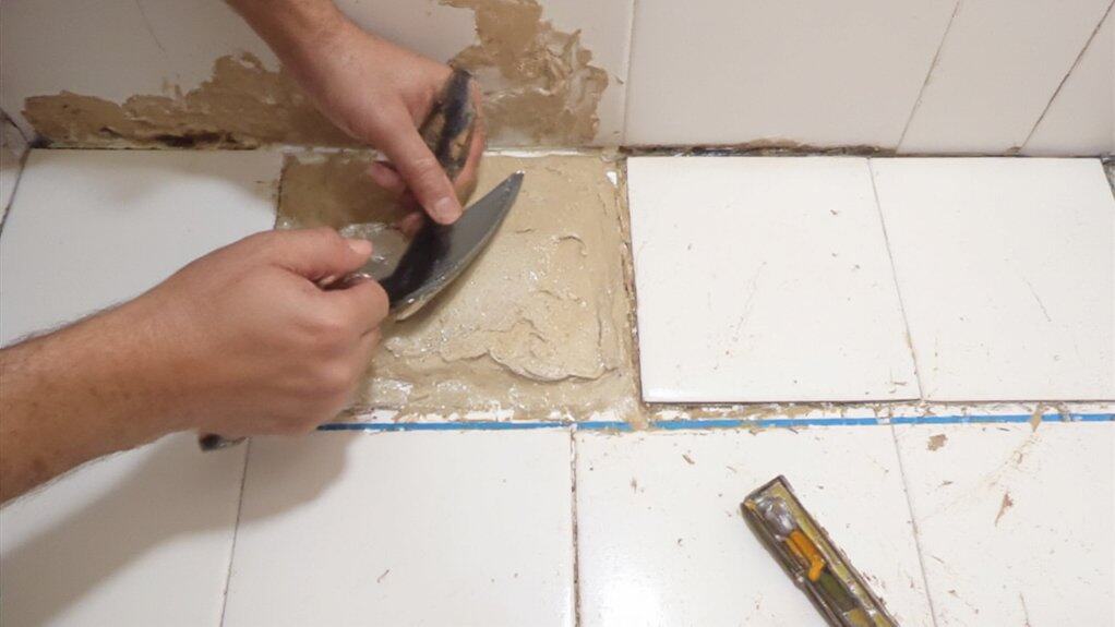 Get ready to apply thin-set mortar, a key step to secure your loose bathroom tile back in place. This adhesive guarantees a strong bond, so let’s do it right.