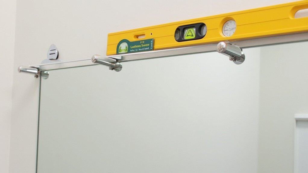Now that you’ve measured your bathroom mirror with precision, let’s get those mounting clips lined up properly. Aligning them evenly guarantees your mirror stays secure and looks straight. Take your time—about 10 minutes—to mark spots with a pencil.