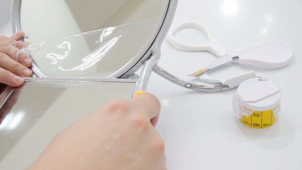Upgrading your mirror’s look with decorative clip covers is just one step; adding a protective backing film can enhance safety and durability. This film prevents shattering if the mirror breaks, keeping your bathroom safer. You’ll need a film roll, scissors, and 10 minutes for this task.
