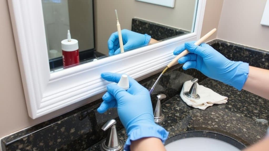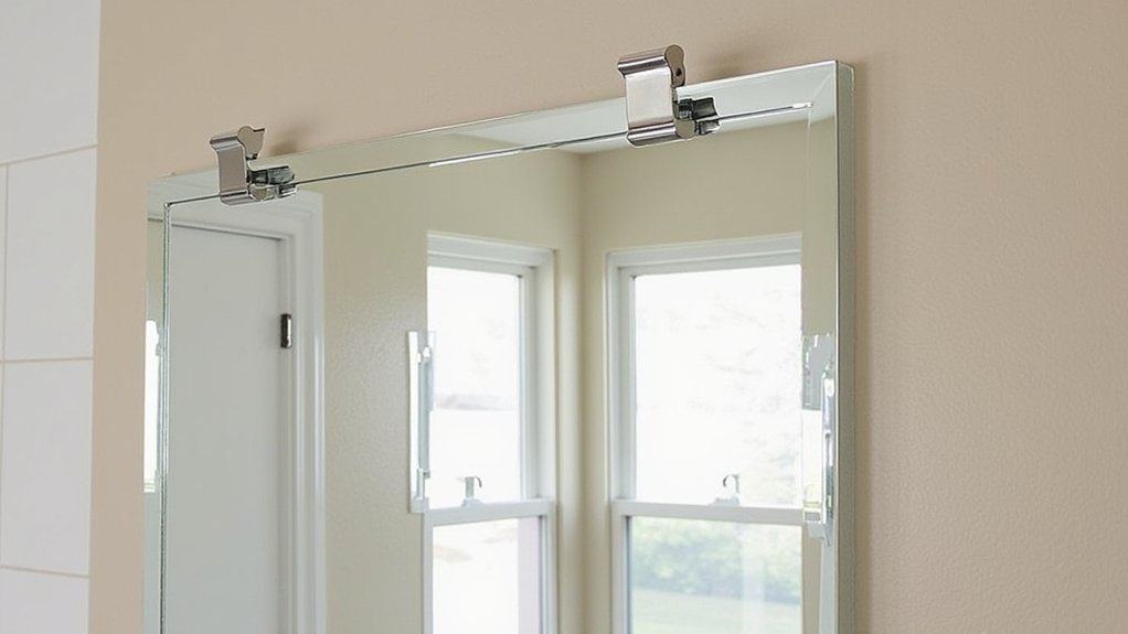 Several key steps will help you secure your bathroom mirror with clips for a sturdy, polished look. You’ve got this—just follow these clear instructions to guarantee safety and style in under 30 minutes.