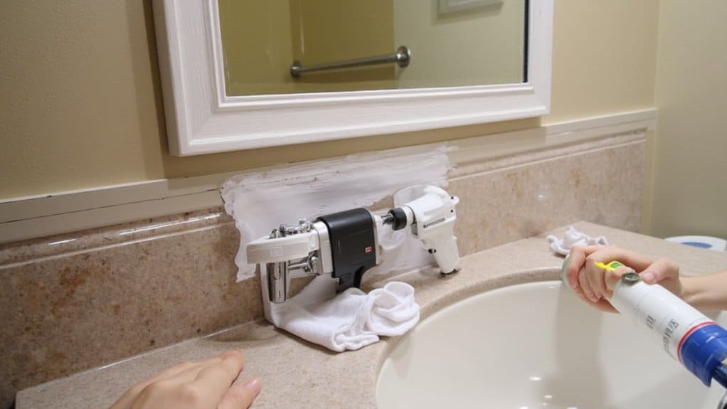 Dive right into attaching your bathroom mirror frame by securing it with adhesive for a sturdy hold. You’ve cut the pieces; now let’s make them stick. Use a strong construction adhesive suitable for mirrors and wood.