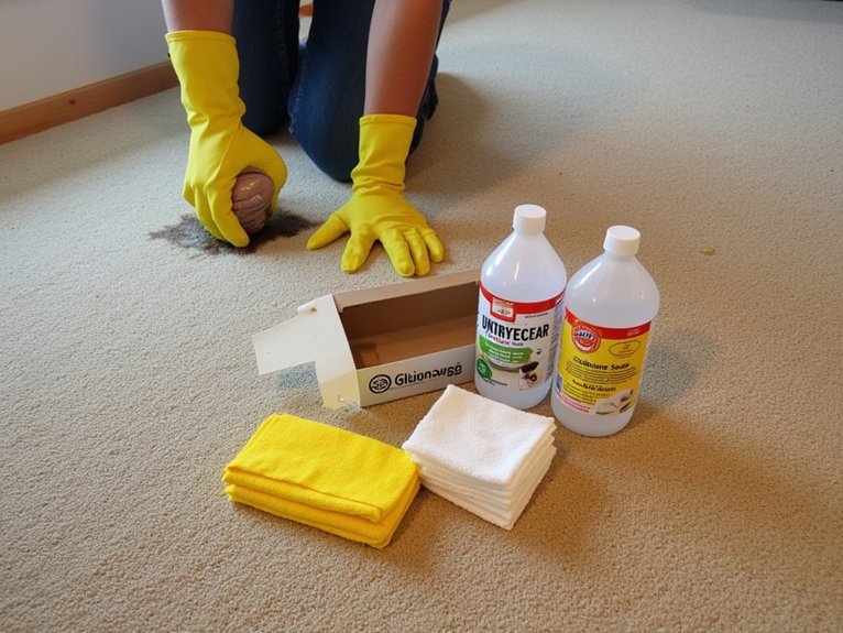 Before tackling cat urine stains, gathering the right cleaning tools and supplies guarantees the most effective odor removal process. Essential items include: