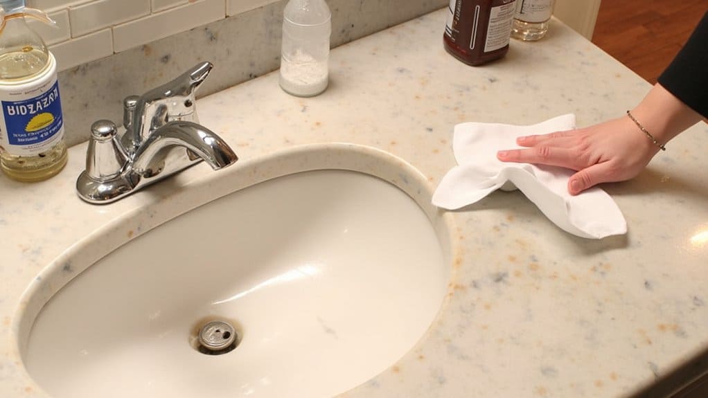 When dealing with mild blemishes on your bathroom countertop, natural remedies can be a gentle yet effective solution. You’ve likely got supplies at home, so let’s tackle those light stains with ease.