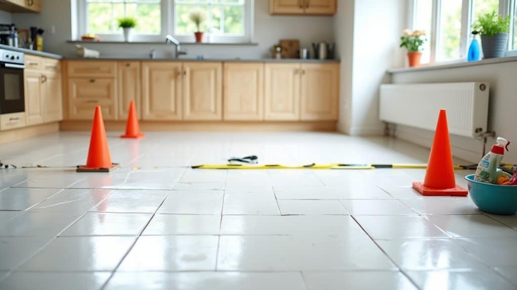 Take a moment to prepare for the essential task of applying grout evenly across your kitchen tiles. This step guarantees a polished, lasting finish, so let’s get it right.