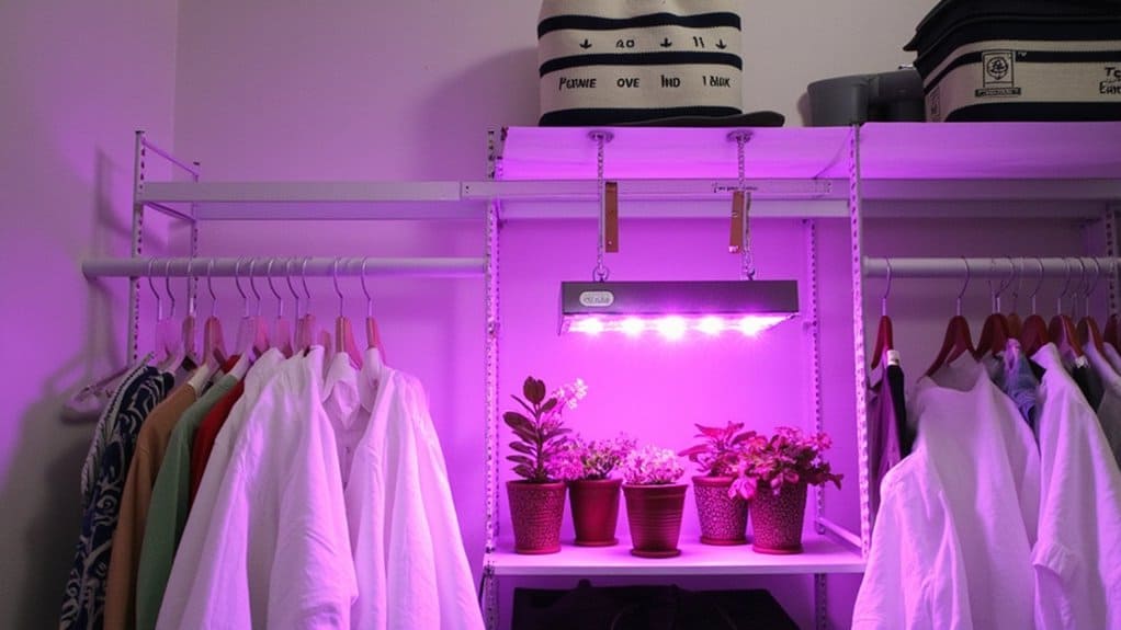 Let’s get started on hanging a grow light in your closet. You’ll transform that small space into a thriving plant haven with the right setup. First, measure your closet width—most are 48 to 72 inches wide. “Accuracy here prevents mishaps,” says horticulturist Jane Smith. What’s the next step to guarantee your light hangs securely? Stick around to find out the precise tools and tricks for success.