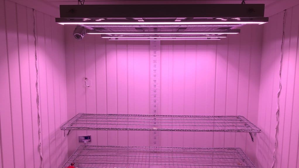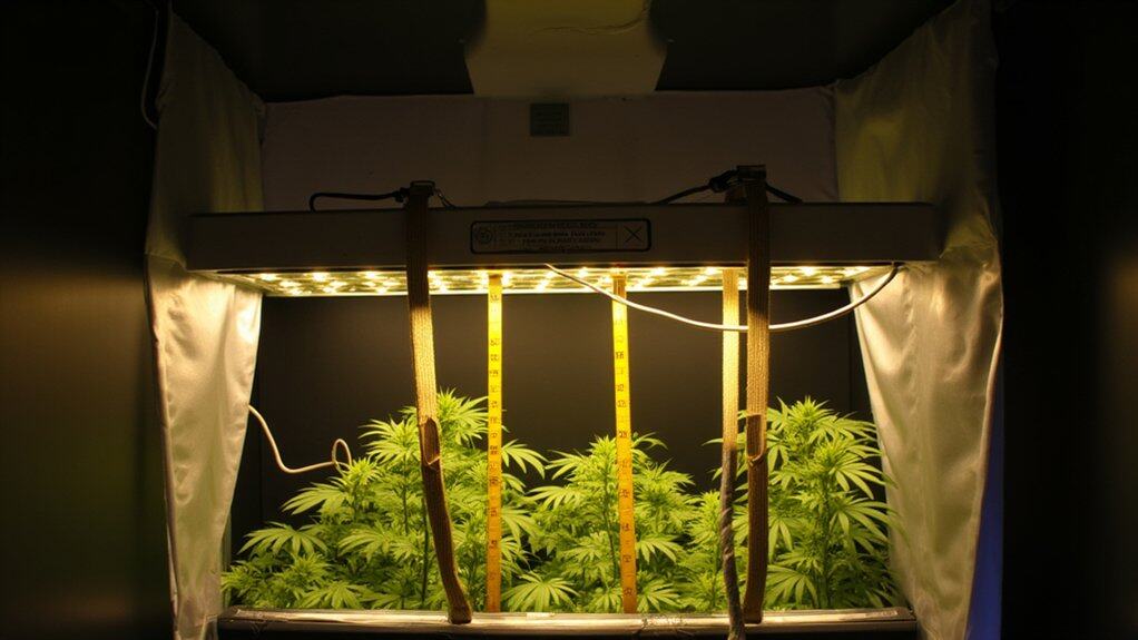 Let’s shift focus from securing your fixtures to fine-tuning the grow light’s position for your plants’ benefit. Adjusting the height of your grow light is essential to guarantee your plants get the right amount of light without burning or stretching. You’ll need to check this often, especially as plants grow taller.