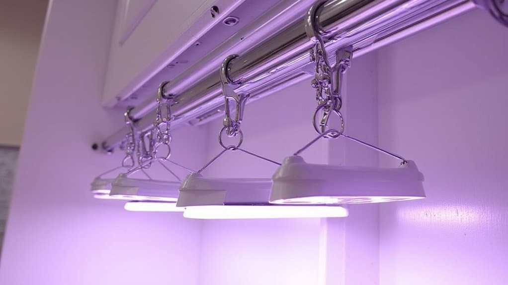 After setting up a solid closet rod, it’s time to tackle securing your grow light fixtures for ideal plant growth. You’ve gotta make certain they’re stable to avoid any mishaps. Use heavy-duty S-hooks or carabiners rated for at least 50 pounds to hang the fixtures securely on the rod. Check the fixture’s weight beforehand to match the hardware.