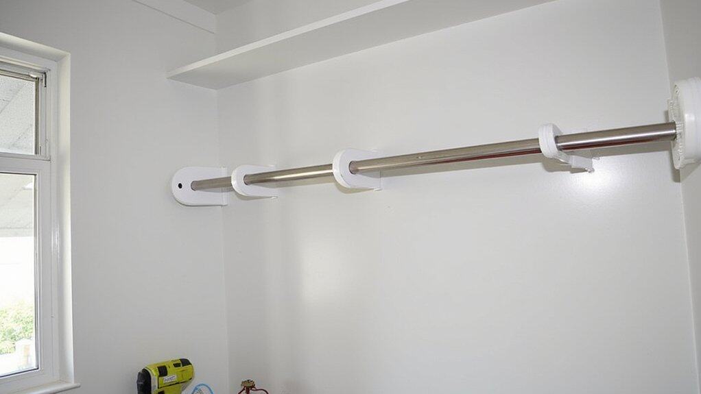 Now that you’ve picked out the perfect LED grow lights, let’s get a sturdy closet rod set up to hang them securely. Installing a closet rod isn’t hard, but you’ll need to do it right for safety. First, measure your closet width—most rods fit 24 to 48 inches—and choose a heavy-duty metal rod that supports at least 50 pounds.