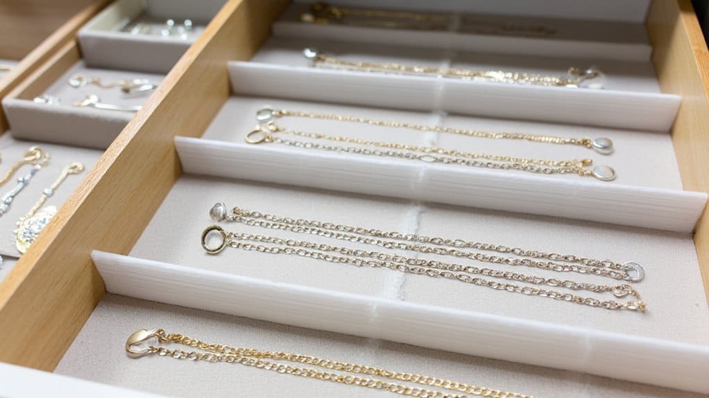 If you’re looking for a hidden yet effective way to store your necklaces, consider using creative drawer dividers. They keep your jewelry tangle-free and out of sight in any dresser drawer. You can customize these dividers to fit a standard 15-inch wide drawer with small compartments.