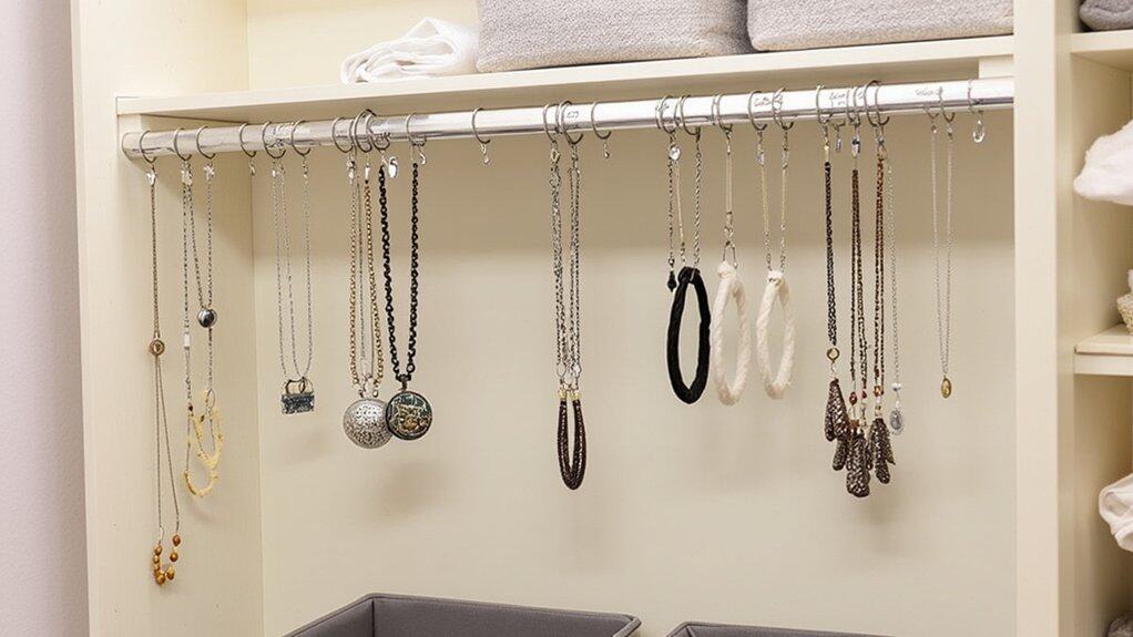 Discover another clever way to store your necklaces with the stylish under-shelf hanger, a game-changer for tight spaces. This nifty device clips under any shelf, usually 1-2 inches thick, in your closet. It’s perfect if you’ve got limited room, as it maximizes unused space and keeps jewelry tangle-free.