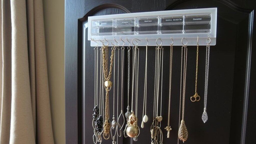 A fantastic solution for storing necklaces is the unique over-door organizer, perfect for maximizing small spaces. You can easily hang it over any standard door, measuring about 1.5 inches thick, and it fits up to 20 necklaces. Install it in under 10 minutes with no tools needed—just hook it on and you’re set!