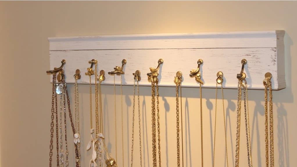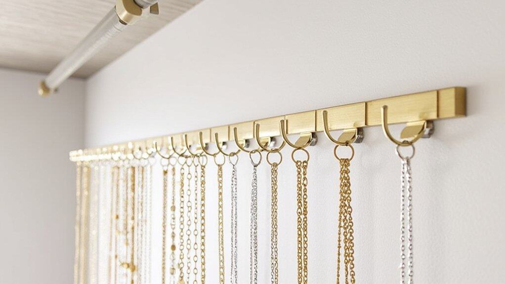 Take a look at clever wall-mounted hooks as another fantastic way to hang your necklaces with ease. They’re simple to install and transform your closet wall into a tidy display in under 30 minutes. Grab hooks with a 1.5-inch projection to prevent tangling, and mount them 6 inches apart for accessibility.