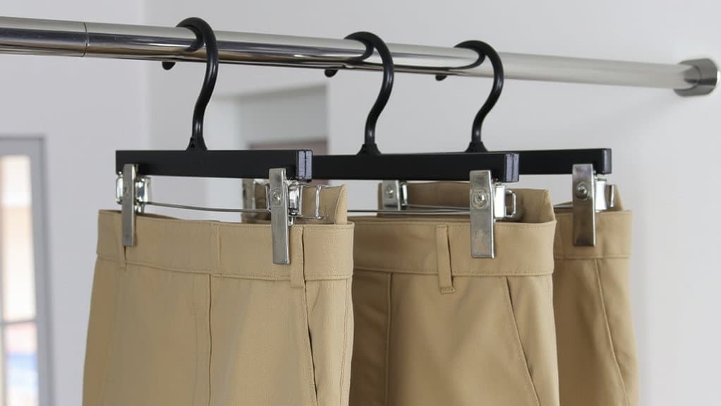 Moving from using pant hangers, you can also keep your trousers tidy by clipping the waistband for a secure hold. This method works great for any closet and prevents slipping. It’s quick, taking just 2-3 minutes per pair, and keeps pants wrinkle-free.