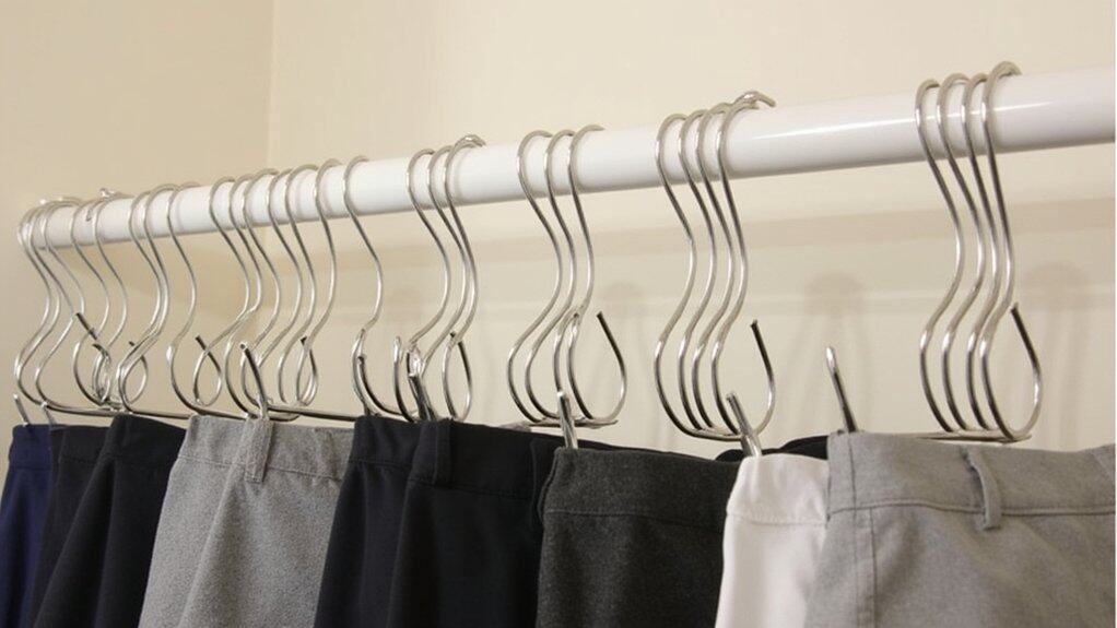 If you’re looking for a sturdier option after trying S-shaped hooks, consider setting up an adjustable pants rack for your closet. These racks save space and keep pants neat, fitting most standard closets with widths of 24 to 36 inches. You can install one in under 30 minutes with basic tools like a drill and screwdriver.