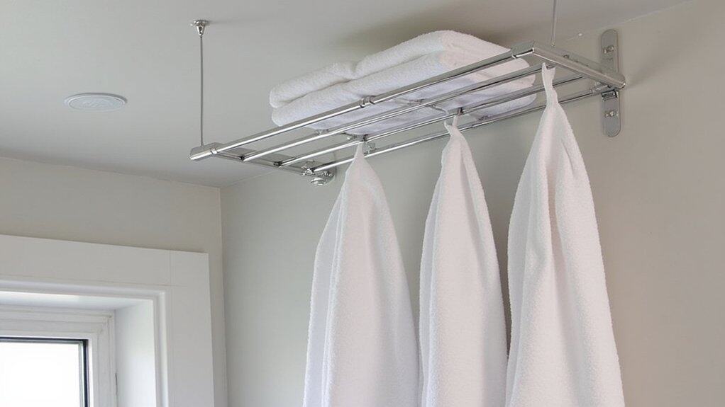 Exploring another spot for towel storage, think about using the space above in your small bathroom with a ceiling-mounted towel rack. It’s a clever way to maximize vertical room when walls are cramped. You’ll need a sturdy rack, about 24-36 inches long, to hold multiple towels firmly.