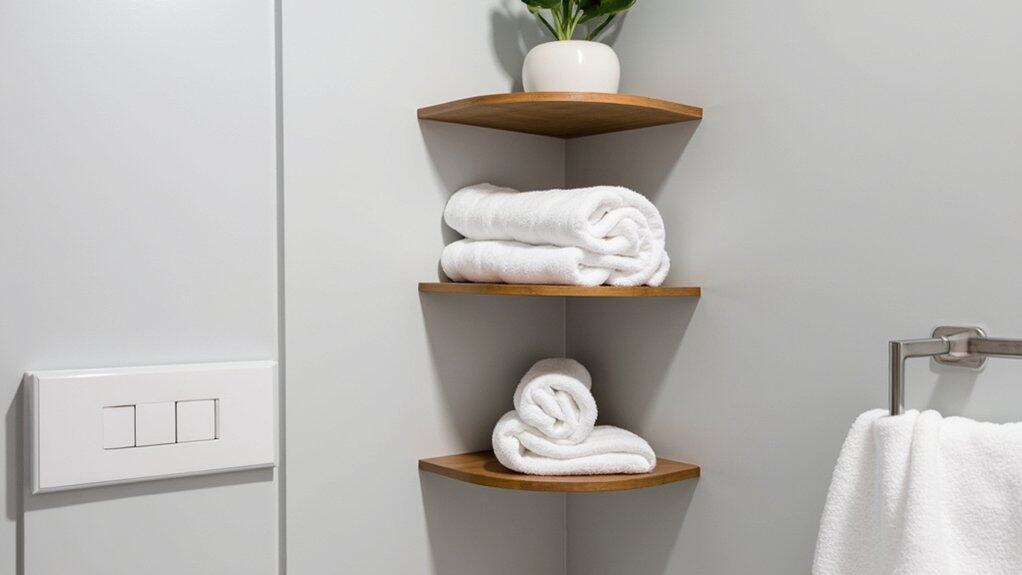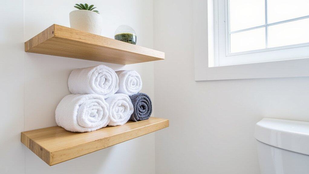 Moving from corner shelf ideas, let’s explore another space-saving gem with a floating shelf towel display. You can transform your small bathroom by installing a sleek shelf above the sink or toilet, maximizing vertical space. It’s both stylish and practical!