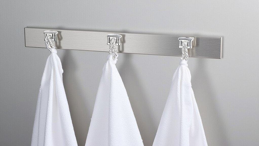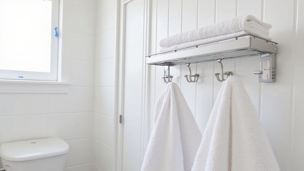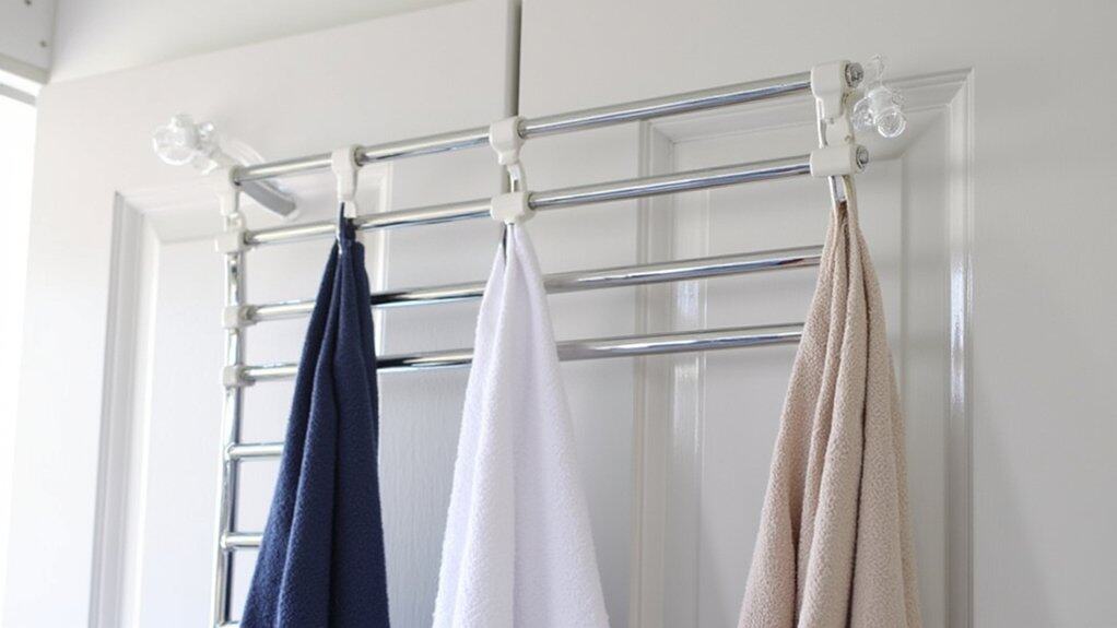 Did you know that a small bathroom can hold more towels than you’d think with the right setup? You’re about to learn smart ways to hang towels without wasting space. Start with an over-the-door towel rack, which fits doors up to 1.5 inches thick and holds towels instantly. As expert organizer Jane Smith says, “Maximize vertical space to keep things tidy.” Curious about more solutions? Stick around for clever ideas!