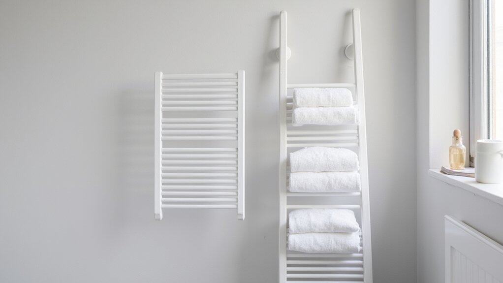 Several smart options exist for towel storage, and a ladder-style towel holder can transform your small bathroom’s look. This space-saving solution leans against the wall, taking up minimal floor space while adding style. You’ll find it’s perfect for hanging multiple towels at once.