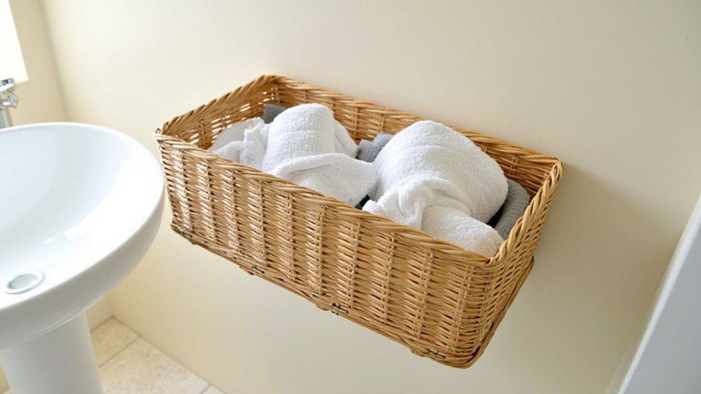 Consider adding a basket-mounted towel holder to your small bathroom for a unique and space-saving solution. It’s an easy way to store towels without taking up wall space, and you can install it in under 30 minutes.