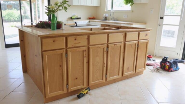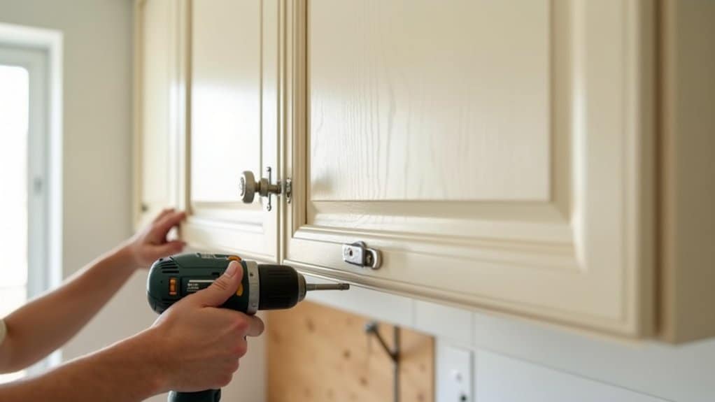Hanging upper kitchen cabinets can transform your space, and you’ve got this with the right steps! Start by grabbing your tools—drill, level, and stud finder—and plan for a 54-inch height from the floor. As expert carpenter Tom Silva says, “Accurate measurements prevent costly mistakes.” Curious how to secure them safely to the wall? Stick around for the critical next steps to guarantee a sturdy setup.