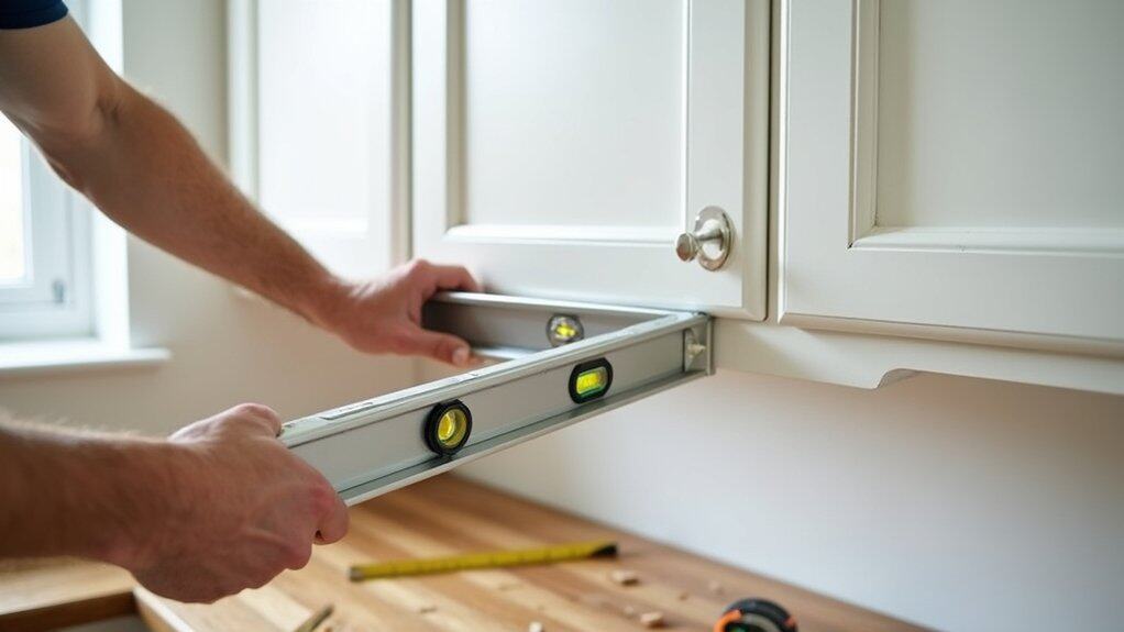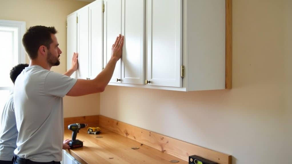 Hey, let’s get started on hanging those upper kitchen cabinets with a clear plan. You’ll begin by measuring your wall space accurately, marking stud locations, attaching a ledger board, hanging the first cabinet, and securing the adjacent one. As expert carpenter Jane Smith says, “Take your time with precise measurements—use a 48-inch level for accuracy before drilling.”