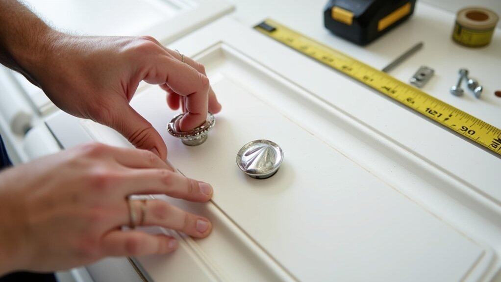 - Measure and mark spots for knobs or pulls, typically 2-3 inches from the cabinet edge.