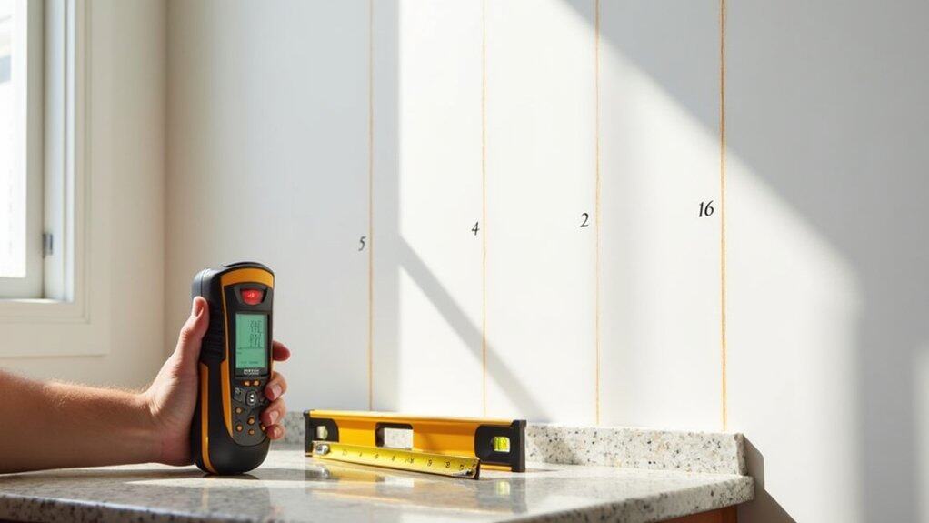 Now that you’ve measured your wall space with precision, let’s move on to finding and marking the studs for secure cabinet installation. Studs provide the strength you need, so don’t skip this step.