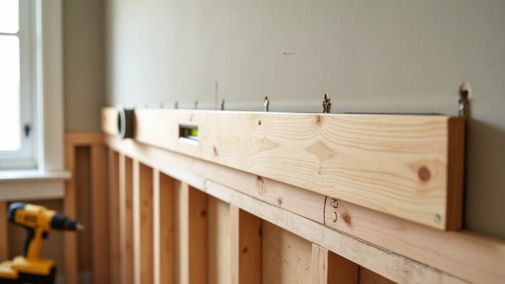 Before you hang those upper kitchen cabinets, let’s secure a ledger board to keep everything perfectly aligned. This temporary support guarantees accuracy while you work.