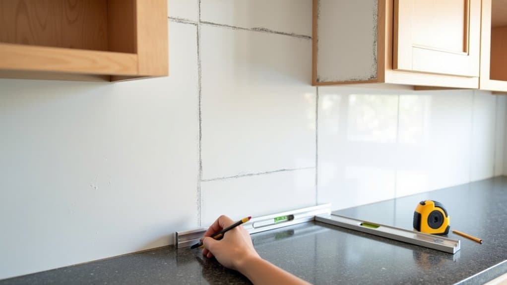 A crucial step in installing your kitchen backsplash is to measure and mark the layout with precision. You’ll need accuracy to guarantee tiles fit perfectly without awkward gaps.