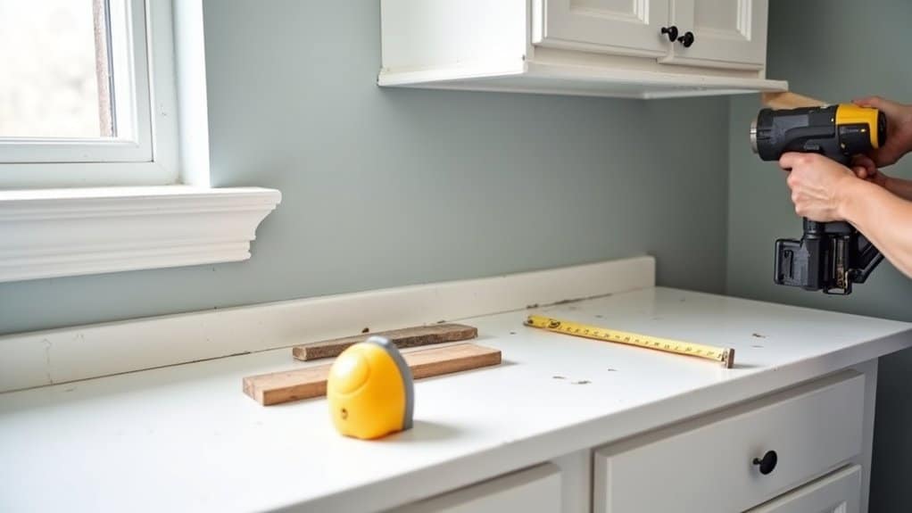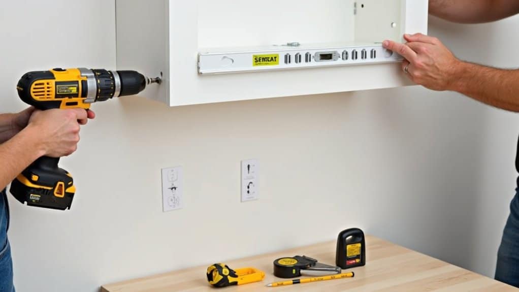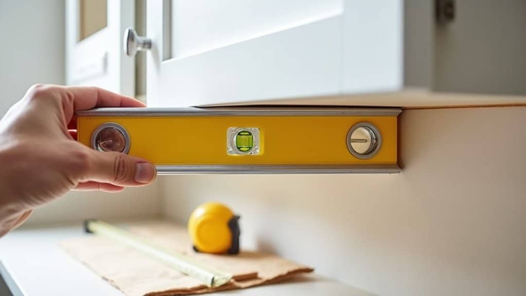 Before you wrap up your wall cabinet installation, make certain everything’s perfectly aligned by checking the cabinet leveling. It’s a quick step that guarantees your cabinets look great and function well.