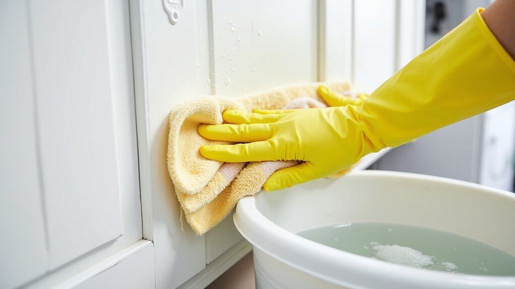 Dive right into sprucing up your wall cabinets by cleaning their surfaces for a fresh, polished look. A clean finish guarantees your laundry room shines, so let’s get started with this easy process.