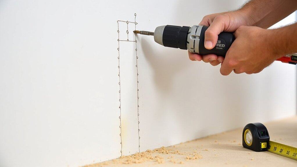 Gear up to drill pilot holes for your wall cabinets, guaranteeing a secure and lasting installation in your laundry room. This step’s vital for a strong hold, so let’s get it right.