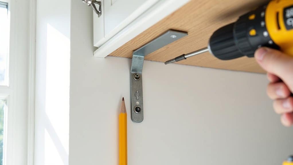 Now that you’ve got your cabinets leveled, let’s move on to securing them with safety brackets for extra stability. Safety brackets prevent tipping and guarantee long-term durability.
