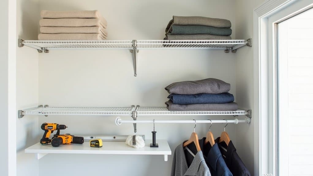 Installing adjustable shelving is a practical solution for keeping seasonal clothing organized, as it allows you to customize storage space according to your needs. Begin by evaluating the available space in your closet or storage area and determining the ideal height for shelves based on the types of clothing you store, such as bulky winter coats or lightweight summer tops. Use a stud finder to locate secure points in the wall for mounting brackets, guaranteeing the shelves will hold the weight of your items.