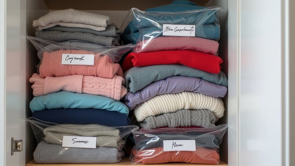 Vacuum-sealing seasonal clothes is an effective way to save space and protect garments from dust, moisture, and pests during storage. Start by washing or dry-cleaning your clothes to guarantee they are free of stains, odors, or insects that could damage the fabric over time. Then, fold the items neatly and place them into vacuum-seal bags, making sure not to overstuff the bags to avoid damaging the seal or the clothes.