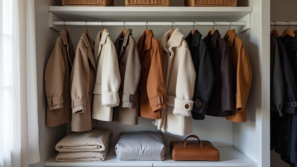 Organizing seasonal coats by hanging them properly can save space and keep them in good condition during off-seasons. Begin by selecting a dedicated closet or storage area with sturdy hangers that can support the weight of heavier coats. Guarantee the space is clean and dry to prevent mold or mildew from damaging the fabric.
