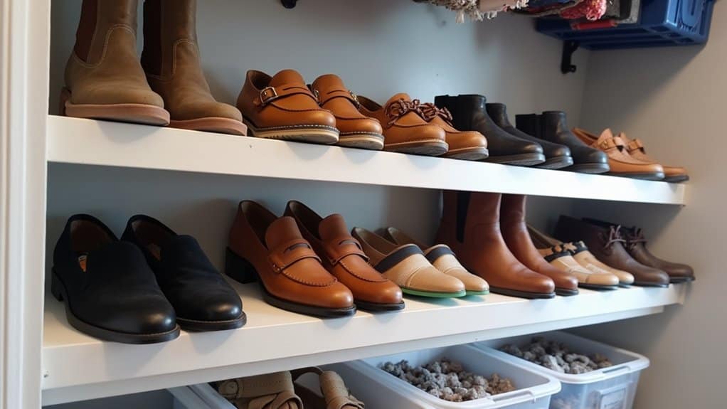 Organizing seasonal footwear is a practical way to maintain a tidy closet and guarantee easy access when the weather changes. Start by sorting your shoes and boots into categories based on the season, such as winter boots, summer sandals, and fall loafers. Store off-season footwear in clear plastic bins or labeled boxes to protect them from dust and damage, keeping them out of sight but easily identifiable.